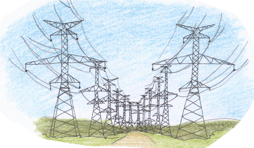 Deux ranger de grands pilônes portant des lignes à haute tension